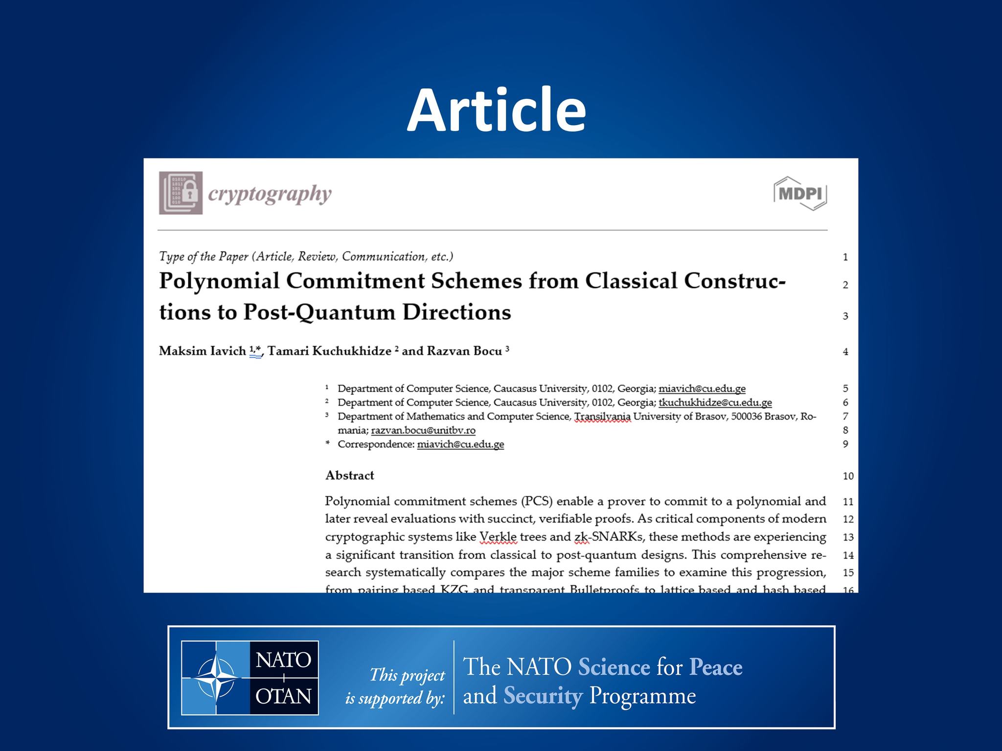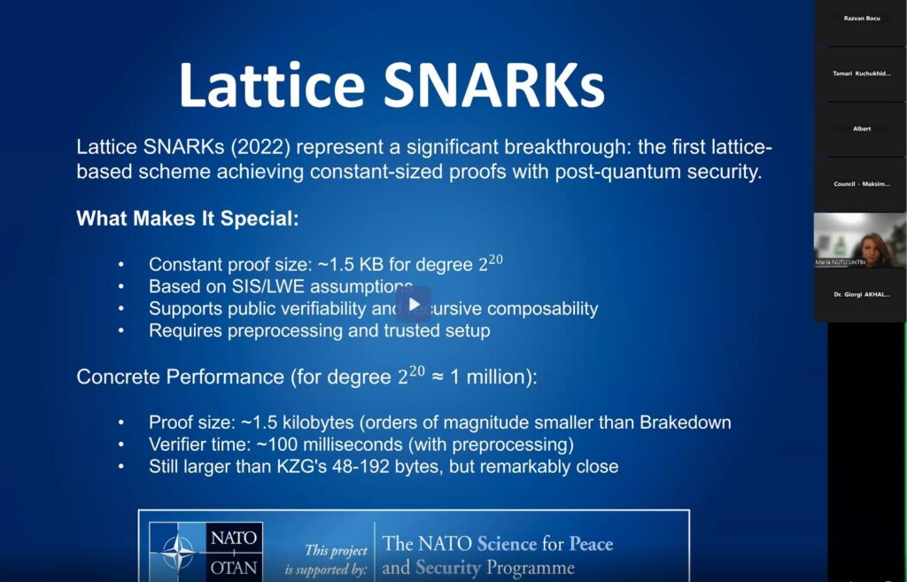 Within the framework of the NATO SPS project, project scholar Dr. Tamar Kutchukhidze delivered an insightful seminar for project members on the topic of “Polynomial Commitment Schemes: From Classical Constructions to Post-Quantum Directions.”