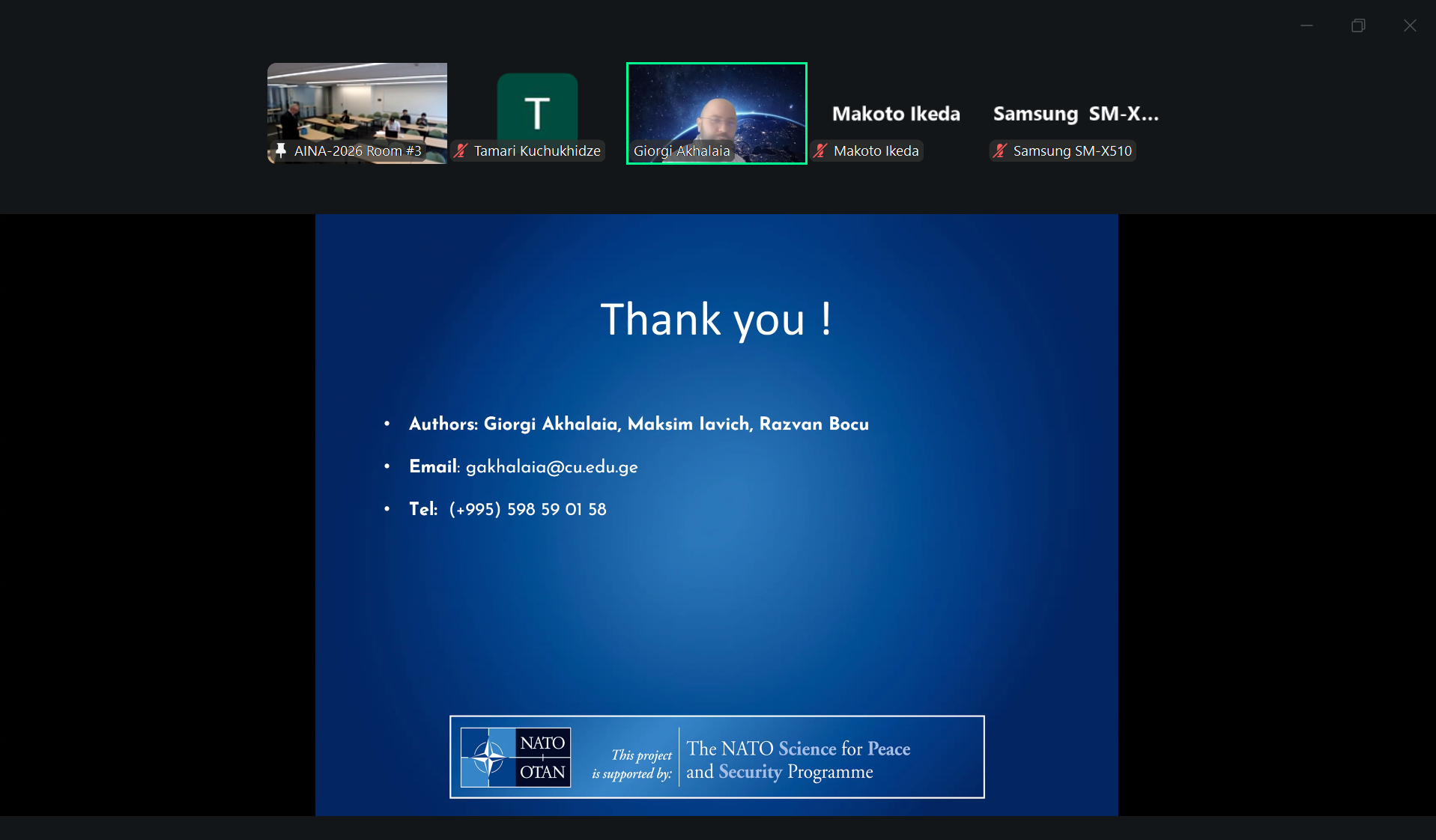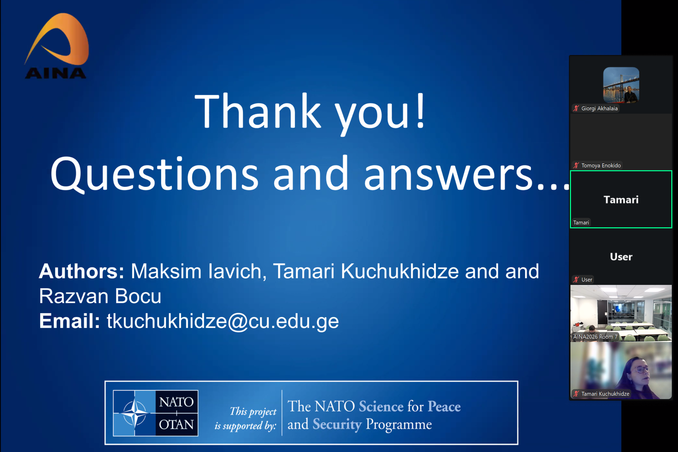 Two researchers from our project, Associate Professors at Caucasus University – Giorgi Akhalaia and Tamar Kuchukhidze – presented the results of their research conducted within the framework of the NATO Science for Peace and Security (SPS) Programme. The presentation took place on April 8-9 at the Rank B international conference – AINA-2026. The research results will also be published as papers.